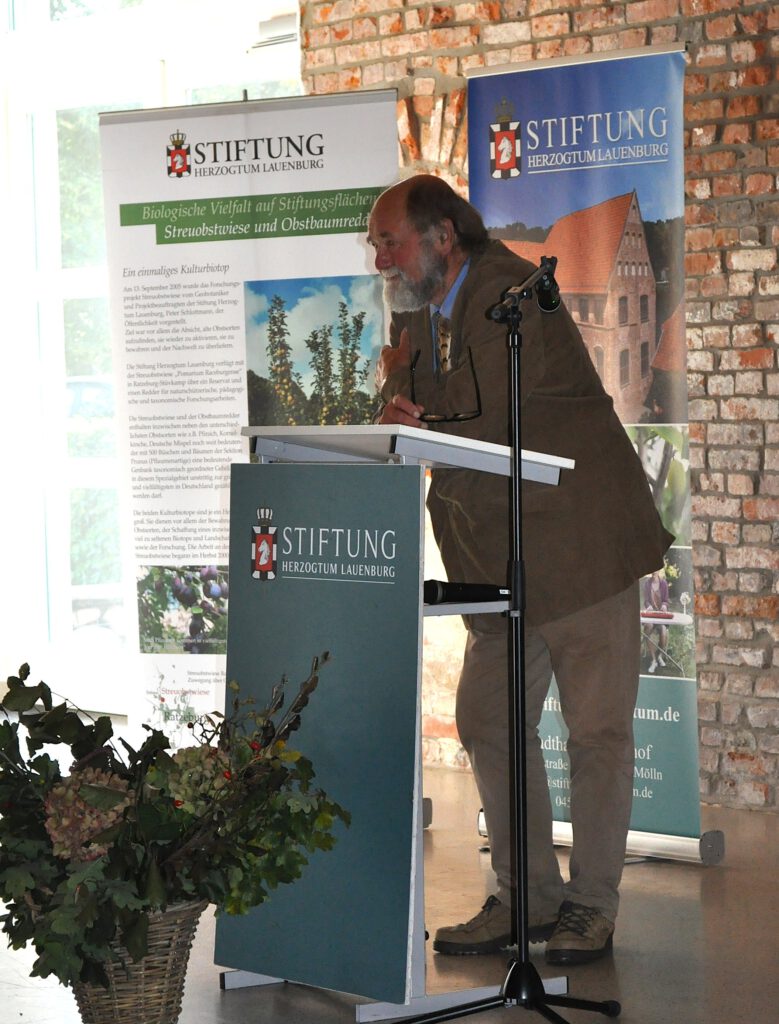 Last but not least übergab die Stiftung Herzogtum Lauenburg den ehrenamtlichen Mitarbeitern der Streuobstwiese Ratzeburg, die in diesem Jahr seit 25 Jahren besteht, je eine Ehrenurkunde. “Sie haben sich seit vielen Jahren in besonders engagierter Weise für die Pflege und den Erhalt dieser Anlage ehrenamtlich eingesetzt. Dafür sprechen wir unseren Dank und unsere Anerkennung aus.”, so Barbara Kliesch, Vizepräsidentin der Stiftung Herzogtum Lauenburg bei der Übergabe der Urkunden. Die Streuobstwiese und der Obstbaumredder in Ratzeburg/Einhaus der Stiftung Herzogtum Lauenburg sind durch die jahrzehntelange Initiative und wissenschaftliche Arbeit des 2023 verstorbenen Schulrates a.D. Peter Schlottmann zu einem deutschlandweit bedeutendem Refugium für seltene Pflaumen- und Apfelsorten geworden.