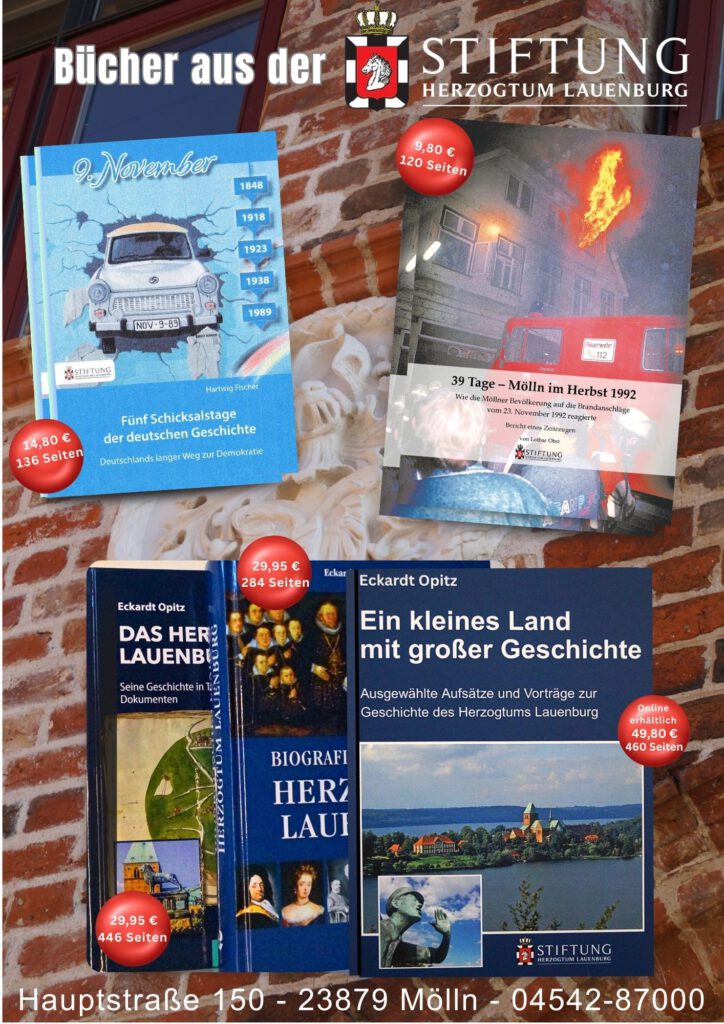 Mölln – Ob als Weihnachtsgeschenk oder als Geschenk an sich selbst: Die Stiftung Herzogtum Lauenburg hält verschiedene Sachbücher für lange Winterabende bereit. „9. November – Fünf Schicksalstage der deutschen Geschichte“ oder „39 Tage – Mölln in Herbst 1992“ sind während der Geschäftszeiten direkt bei uns im Stadthauptmannshof erhältlich. Das in diesem Jahr erschienene Buch „Ein kleines Land mit großer Geschichte“ von Eckardt Opitz, das sich mit der Historie des Kreises Herzogtum Lauenburg beschäftigt, ist online über www.epubli.de bestellbar.